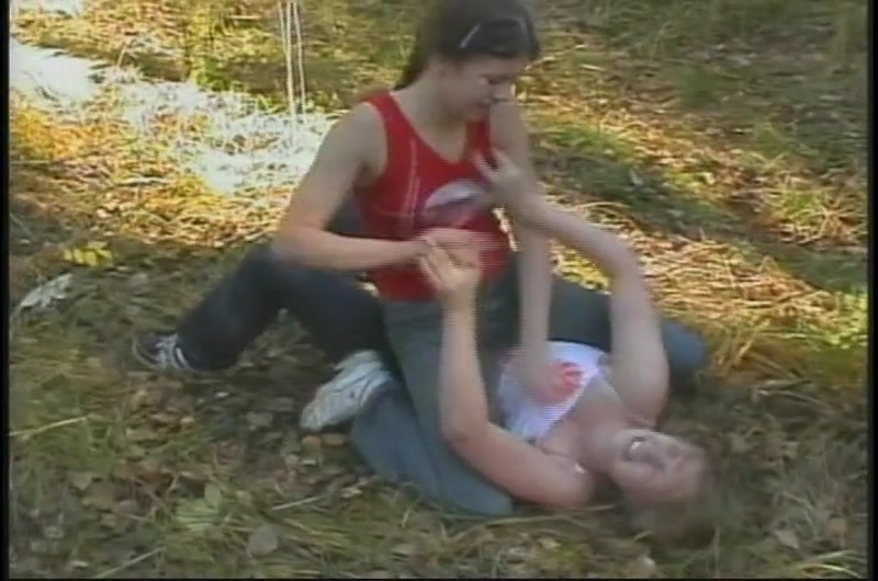 This outdoor real fight features very attractive females dressed in jeans and tank tops. The action starts with takedowns, face slapping and kicks then gets much rougher and more exciting. There is a lot of body punching, head punching, hair pulling, schoolgirl pins and facesits. They exchange the top position numerous times with the outcome in doubt until the very end. The stronger female overpowers the loser and traps her head beneath her knee and keeps her there with face rakes and head punches until she cries stop and submits after 15 minutes of rough, tough female fighting.